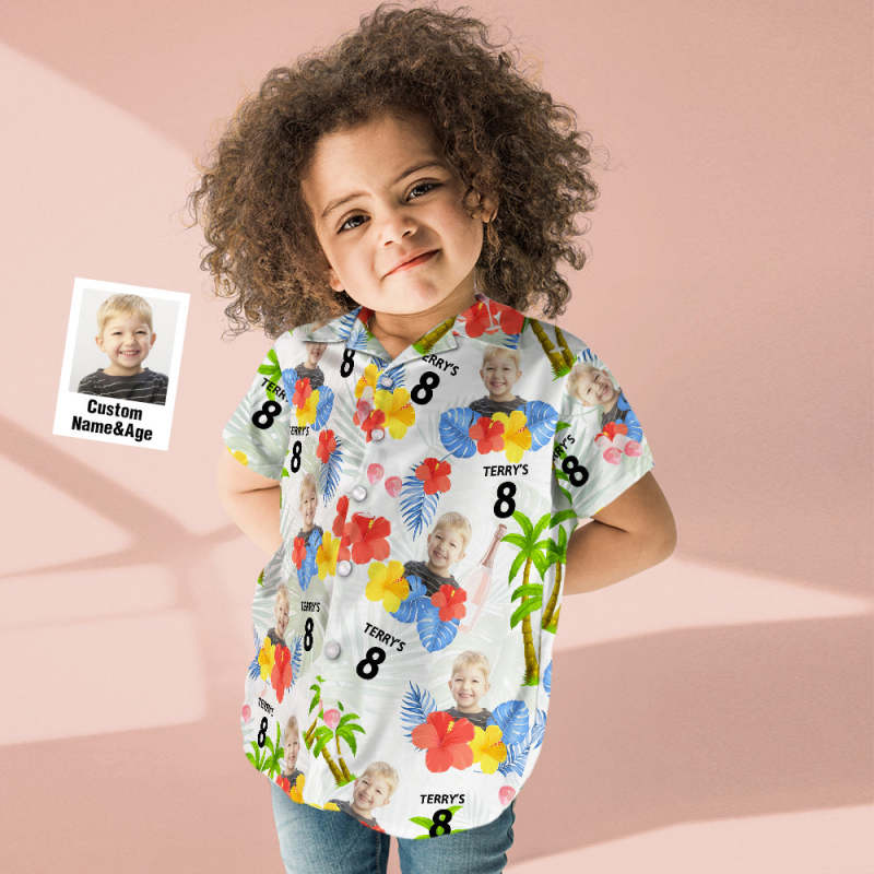 Custom Age and Name Birthday Face Hawaiian Shirt Red Flower and Palm Tree Kids Hawaiian Shirt