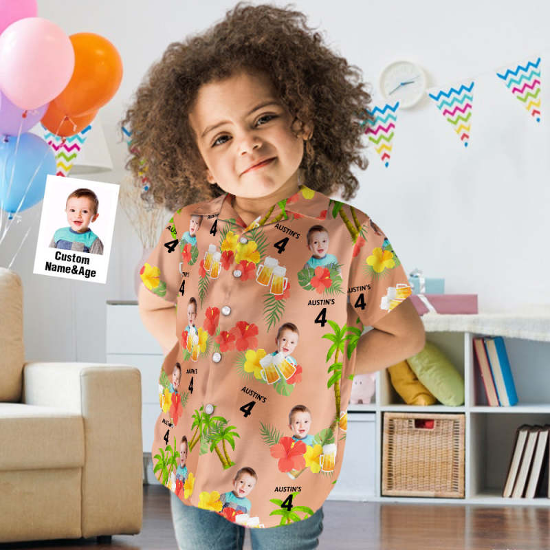 Custom Age and Name Kids Face Hawaiian Shirt Birthday Hawaiian Shirt Red Flower and Palm Tree Shirt