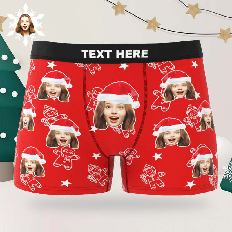 Custom Christmas Underwear with Face Personalised Boxers Printed with Biscuit Pattern & Hats Gift for Boyfriend
