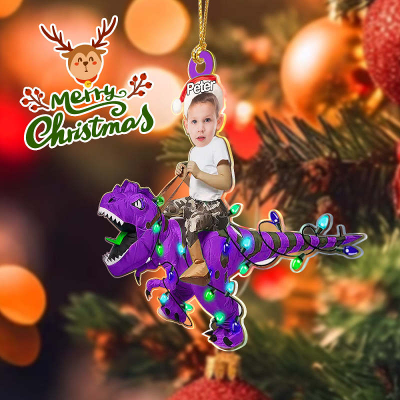 Add a personalized touch to your Christmas decorations with this cute kid riding a dinosaur ornament. Featuring your child's name, it makes the perfect gift for any young dinosaur lover. This ornament is sure to become a treasured keepsake for years to come.
