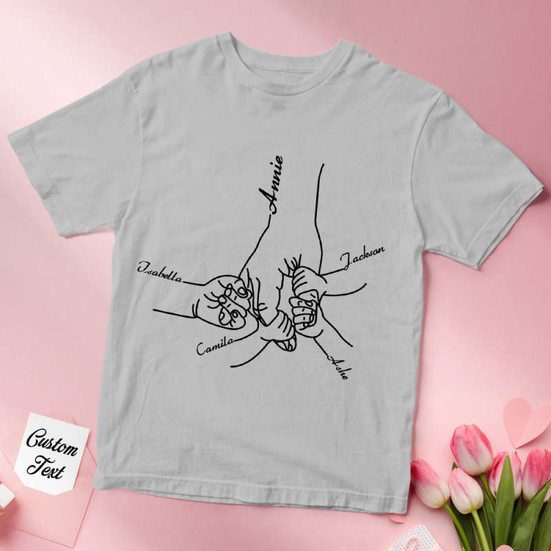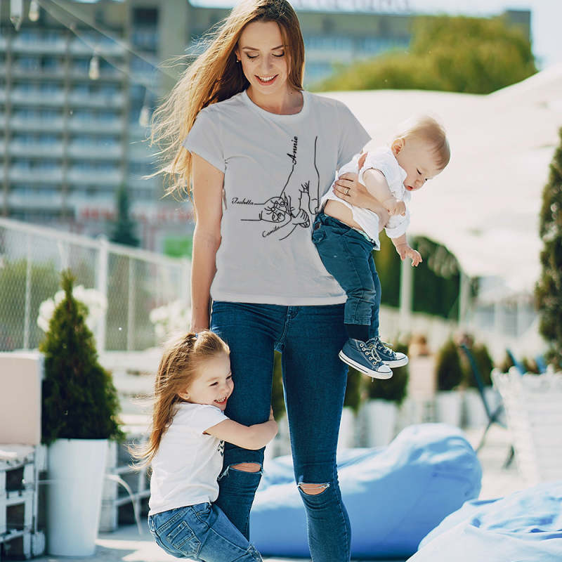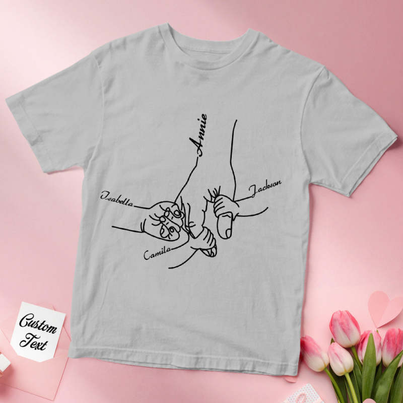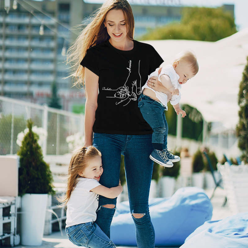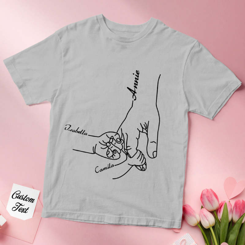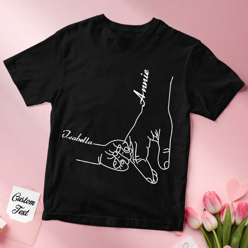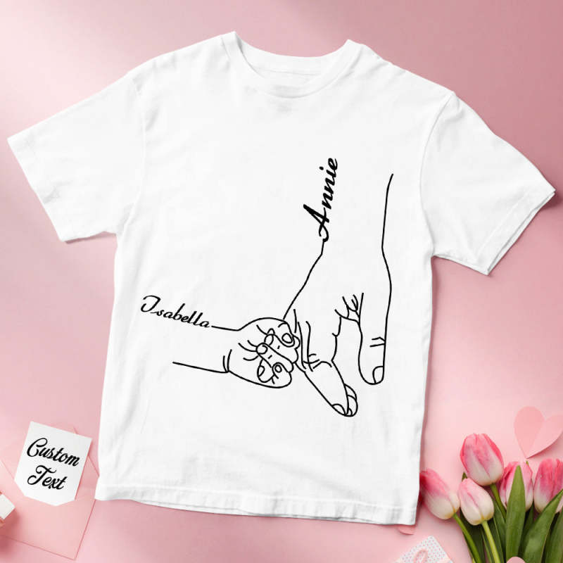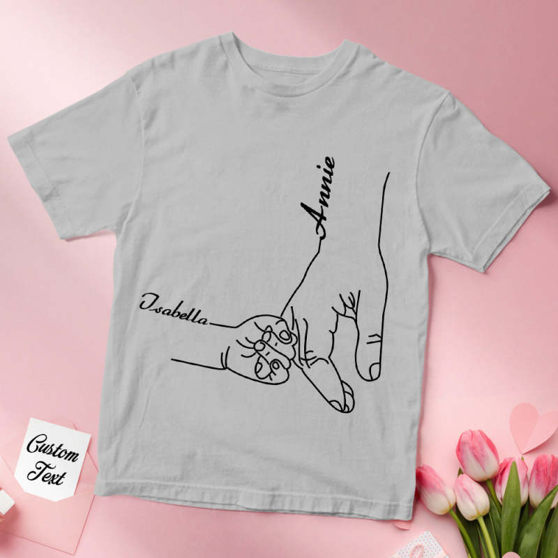 - Custom-design. Our t-shirt features a beautiful design of a mother holding her child's hand, a symbol of the unbreakable connection between them. Choose from a selection of names to create a one-of-a-kind t-shirt that will bring a smile to her face.