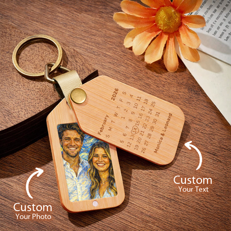 Personalised Wooden Cartoon Style Photo Keychain Customized Date Gift for Couple