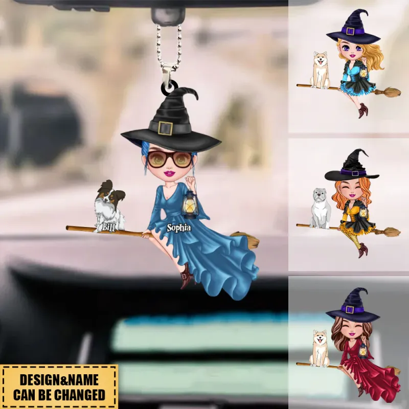 Witch Riding Broom Mystical Girl With CuteDog Puppy Pet Personalized Car Ornament